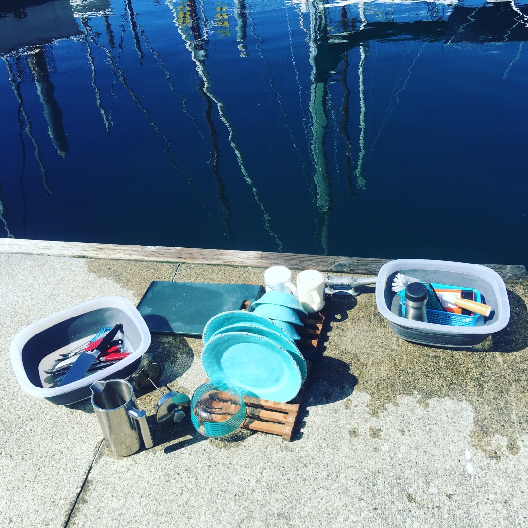 In fact, most things about living on a sailboat bring me gratitude. The romantic part is easy to love. The day to day is what really cements boat life for me. When you live on land, with so many modern conveniences you rarely stop to relish in the fact that hot water comes pouring out of a spout at your easy command. It’s not a common thing to just stare at your washer and dryer, refrigerator, or vast countertops and soak in the appreciation for modern living. Flushing toilets are amazing! I have a composting toilet, which basically means I pee in a jug and shit in a bucket. The bucket is full of coconut husks to break down my poo, but unless cruising, it fills fast. To save on emptying them, I usually walk up to the marina head to take care of my business. I’ve got my unique peristalsis contractions down to the second to know just how long I can make it, walking up a long dock and up a huge ramp, and crossing a parking lot to poop. It’s inconvenient. Sometimes it is cold and wet. I love it. I love it because when I’m in an apartment I often hole up and never leave. I tend to cocoon in and not feel the fresh air on my skin. It’s refreshing to see all the birds and boats, sky and water on my way to a morning bodily calling. I wash my hands in warm water after and get kinda blissed out. Small things become so enjoyable. I must hand pump cold water to wash on the boat.