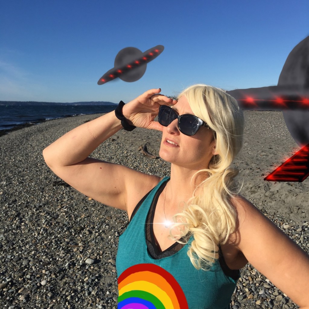 Finally some fucking clarity of how we got into this fucking space-time mess. We threaded onto a beach, it looked just like Golden Gardens in Seattle but void of civilization. Landing all around us were the round space ships. Out of one of the ships walked….you guessed it: another Jenn. She walked over to us like a fucking super model, all confidence and sass and took off her shades to stare us down. She looked exceptionally like my Basic Jenny double.