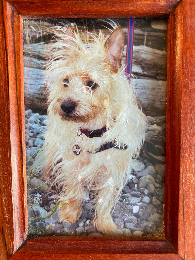 He stands majestically, windswept on the rocky beach. He looks longingly to the horizon past the waves. His dark eyes are pondering, intensely focused. He wears a harness to contain his excitement; a red collar and leash hold him back. He has a tiny handmade charm hanging, his silver necklace that identifies him as Appa. His golden fur, much like a lion’s mane, shags out from his body to increase his size and stature. He is a tiny dog, maybe 15 pounds wet. He has pointed ears almost half his leg size. They stand atop his head like a crown, radars listening for all manner of movement. Black eyes, black nose, black lips pursed to a slight pucker at the end of a tiny, pointed face.